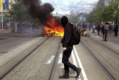Ni vet förstås resten. Dagen efter flög gatstenar och annan bråte över ridande poliser vid Götaplatsen, skotten från polisen och upploppen vid Vasagatan och Vasaplatsen. Polisens övergrepp vid Hvitfeldska Gymnasiet och besöket av George W Bush. Organiserade professionella maskförsedda politiska huliganer som åkte världen runt för att skapa kaos och förstöra för dom som ville försöka protestera och demonstrera på ett fair sett.
